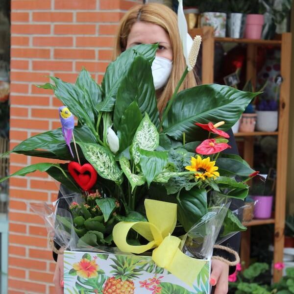 96,00 € Caja de madera de temática tropical llena de plantas naturales surtidas de variedad y color con detalles de fantasía en forma de pajaritos, abejas o mariposas acompañadas siempre de una lazada decorativa. Perfecto para regalar para los amantes de la naturaleza. Tiene un tamaño espectacular para sorprender a quien tú quieras de la manera más impresionante. Añade un globo felicitando a tu mamá si te gusta este detalle.